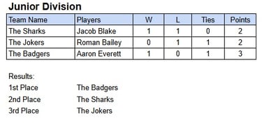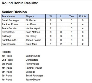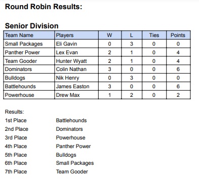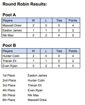 This year, the tournament was split into two separate days for the first time. The Junior division had ideal conditions and played a series of hard-fought games. In the end, Jacob and Bailey edged out the competition for their first-ever victories and couldn't wait to go tell their brothers! Everyone had an amazing time and thank you to all the parents and players that were there!